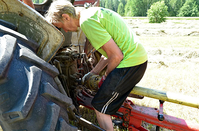 Traktori paalauskoneen eteen ja menoksi. Isäntä Jussi hallitsee konepuolen jutut.