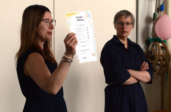 Sanna Kuosmanen (vas.) ja opettajakollega Johanna Laari jakoivat todistukset oppilaille.