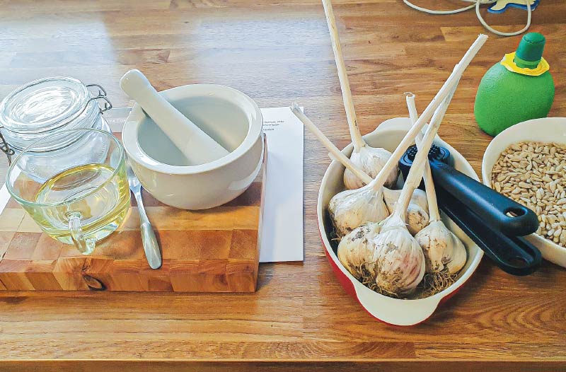 1. Murskaa valkosipuli morttelissa, voit lisätä suolaa jo tässä vaiheessa.