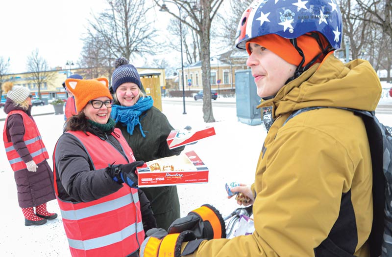 Jonna Kajander tarjoili toritapahtumassa suklaisia suukkoja, vuorossa nuorimies Aku Valtola. Taustalla myhäilee valtuustopaikkaa edelleen tavoitteleva Heidi Holopainen.