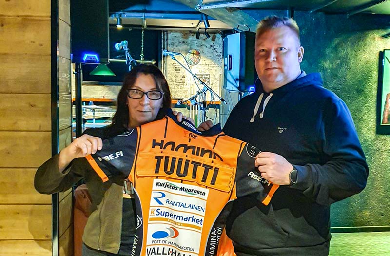 Jari Toikka pitelee tyytyväisenä juuri huutamaansa Jere Heikkisen pelipaitaa. Paita on hankittu ”sopivaan” hintaan huutokaupasta Meyerin yökerhossa.