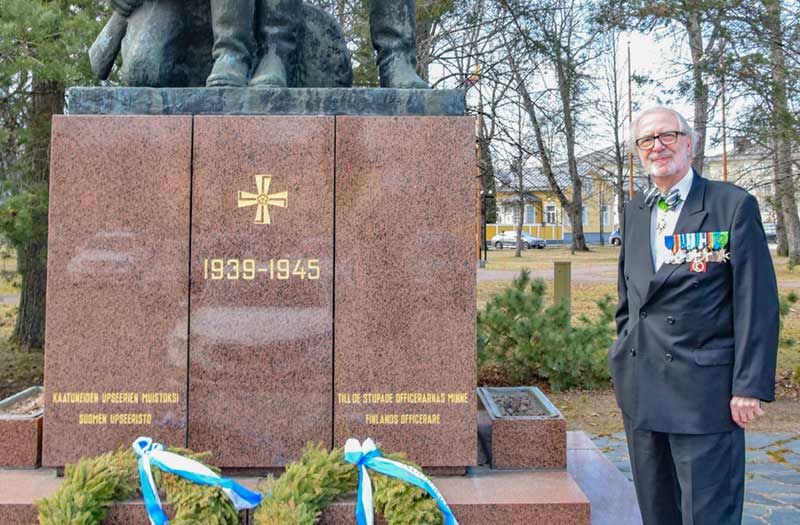 Mauri Sompa vietti oman hiljaisen hetkensä kaatuneitten upseerien patsaalla ennen pitkää ajomatkaa kotiin Jyväskylään.