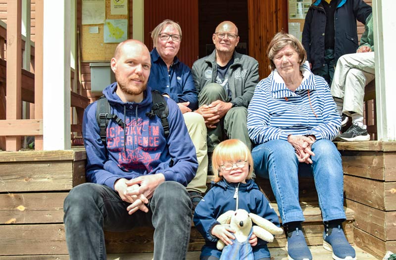 Kuorsalon seurantalon portailla neljä sukupolvea saarelaisia: Mia Hirvonen (takana vas.), Pekka Hirvonen, ja Sinikka Hirvonen. Etualalla Jussi ja Manu Hirvonen.