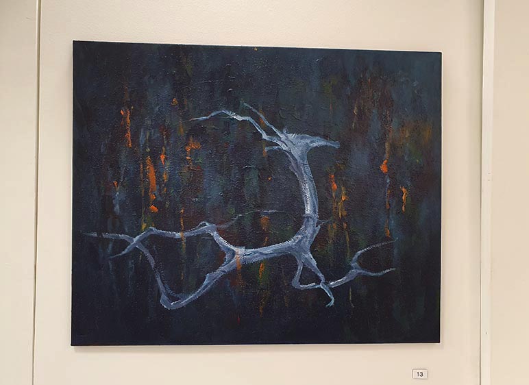 Outi Turtiaisen akryylimaalaukset tavoittelevat luonnon salaperäisyyttä todellisuuden takana. Sinikka Ustinov-Jones tuo näyttelyyn keramiikkaa.