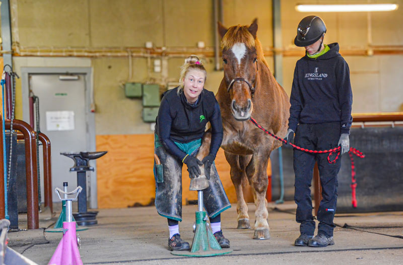 Myös muut luonnonvara-alat esittelivät toimintaansa. Hevosalan taitovalmentaja ja opettaja Saara Kotiranta antoi Monni -hevosen kanssa kengitysnäytöksen.