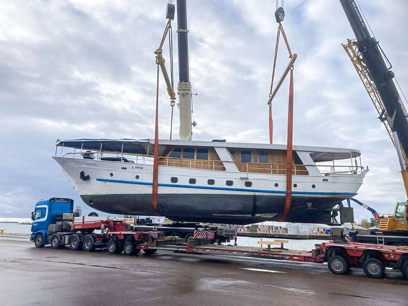 Monivaiheinen oli myös m/s Charlotten viimeisin siirtymä Lappeenrannan Mustolan satamasta Haminaan. Lappeenrannan päässä kaikki toimi luontevasti: 60 tonnin Charlotte nostettiin kuljetuslavetille ja matka alkoi.