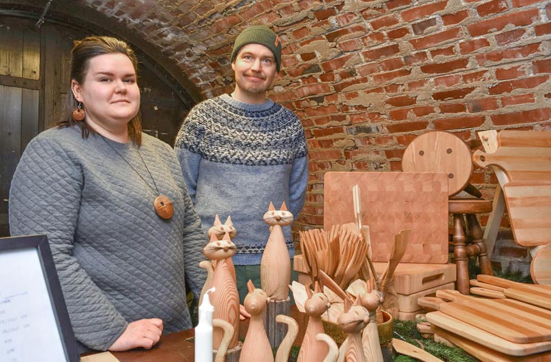 Sisällä holvistossa esittelivät Oona Paronen ja Niko Lautala Oonan isän, Nikon appiukon Veikko Parosen puutöitä.