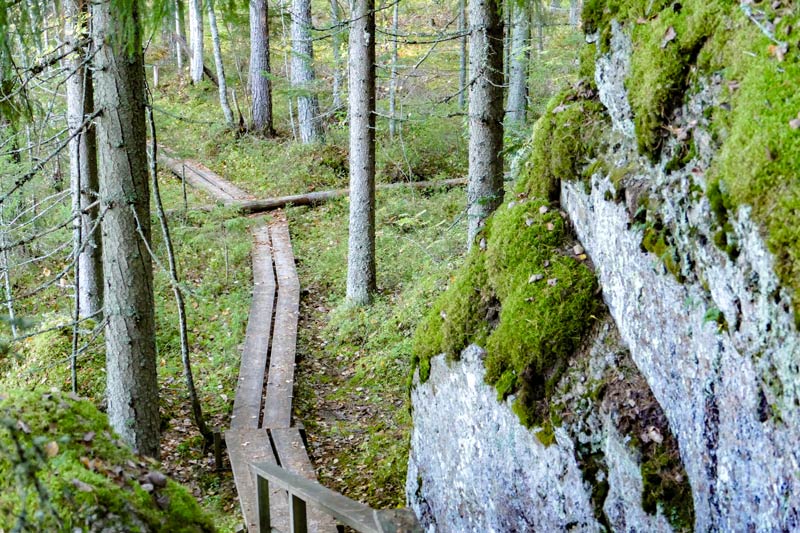 Jos haluaa ulkoilun lisäksi tutustua suomalaiseen mytologiaan ja kansanperinteeseen, kannattaa suunnata askeleensa tälle noin neljän kilometrin mittaiselle reitille Miehikkälään. Oranssein merkein ja kepein merkitty reitti ei ole kaikilta osin ole helpoimmasta päästä. Sen jyrkimmällä kohdalla saa kokeilla taitojaan myös köysikiipeilyssä. Vastapainoksi reitti tarjoaa katseltavaksi hienoja näkymiä Myllylammelle ja upeita kalliomaisemia.