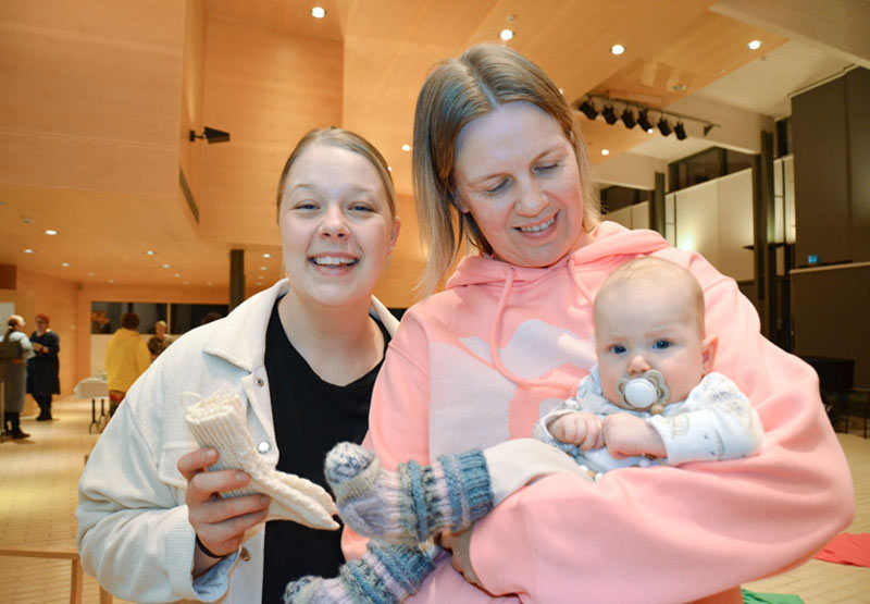 Vauvat saivat villasukat. Alva, Maiju ja Tia Leppä ihailivat luonnonvalkoisia sukkia.