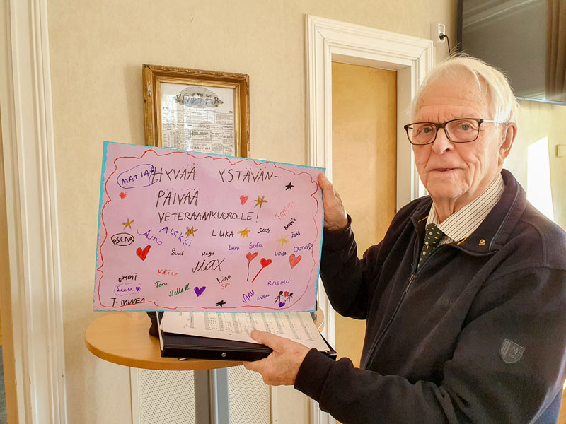 Ennen esityksen alkua kuorolaiset lauloivat Raittiustalon kahvilassa ystävyyslauluja, ja oppilaat ojensivat kuorolaisille askartelemansa ystävänpäiväkortin.