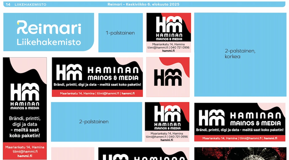 Voit toimittaa meille ilmoituksen tekstit, yrityksen logon ja kuvituksen sähköpostilla reimari@reimari.fi. Meille saa toimittaa materiaalia myös soittamalla tai käymällä toimistollamme.